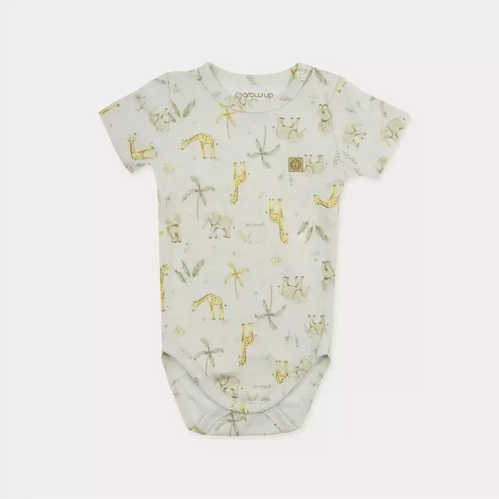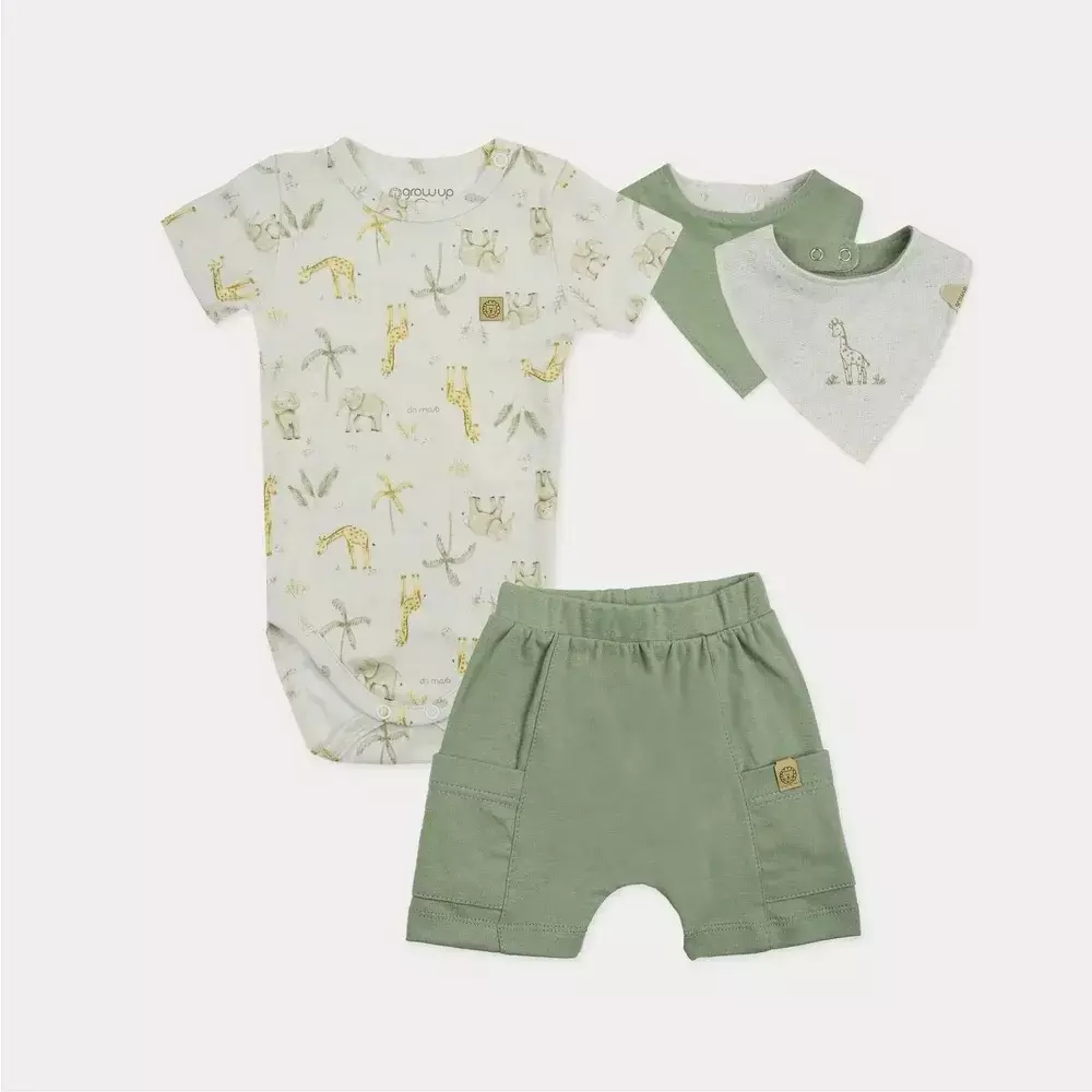 - Design Divertido: O body de manga curta tem uma estampa com desenhos de girafas, macacos e coqueiros. O short, na cor verde, tem bolsos laterais, e o kit de babadores, um com estampa lisa na mesma cor do short e outro com bordado de girafa, complementa o visual.